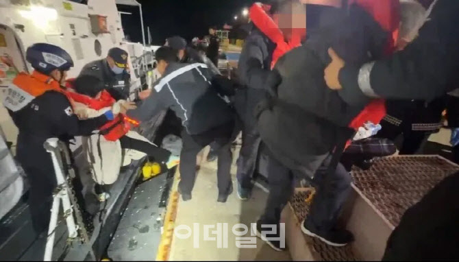 19일 저녁 8시17분께 전남 신안군 장산면 장산도 족도에서 좌초 사고가 난 여객선 퀸제누비아2호 승객들이 목포해경 구조정을 이용해 육지로 이동하고 있다.[목포해경 제공]