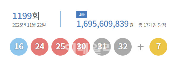 당첨번호 6개를 모두 맞힌 1등은 17명으로 한 사람 당 당첨금 16억9561만원이 돌아간다. 1등 당첨번호 5개와 보너스 번호가 일치한 2등은 75명으로 각각 6406만원을 받는다.