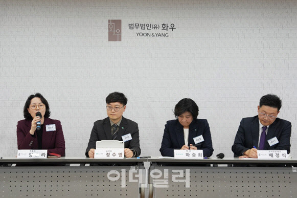 양소라(왼쪽 첫번째) 화우 변호사가 ‘공익신탁 실무와 현장의 과제’에 대해 토론하고 있다. 왼쪽부터 양 변호사, 정수영 초록우산 어린이재단 본부장, 하승희 하나은행 팀장, 배정식 화우 수석전문위원. (사진=법무법인 화우)