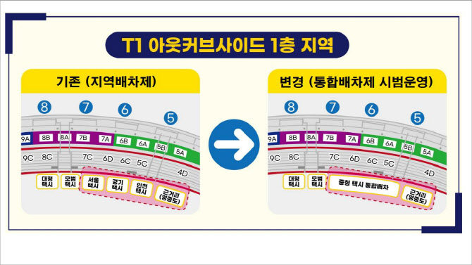 인천공항은 국토부 훈령에 따른 택시 공동사업구역으로 서울, 인천, 경기 부천, 광명, 김포, 고양 등 6개 지역 택시가 공동으로 운행한다. 기존 제1여객터미널 택시 승차장은 승객들이 서울, 인천, 부천 등 목적지에 따라 각기 다른 승차장을 이용하는 ‘지역 배차제’를 운영했다. 이 방식은 탑승 전 승객들이 해당 지역 택시 승차장을 찾아 이동해야 하는 번거로움과 이를 위반할 경우 택시기사들이 부정승차로 제재를 받는 부담이 있었다.