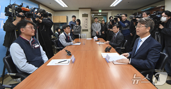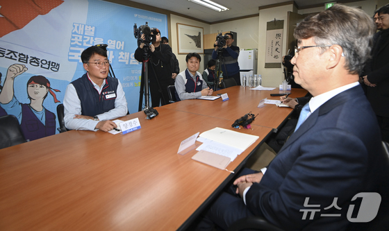김지형 경제사회노동위원회 위원장과 양경수 전국민주노동조합총연맹 위원장이 25일 오전 서울 중구 민주노총에서 공식 회동을 하고 있다. 민주노총이 경사노위(당시 노사정위원회) 관계자와 공식 회동을 갖는 것은 1999년 2월 이후 처음이다. (공동취재) 2025.11.25/뉴스1 © News1 김민지 기자