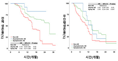 무이상반응군(Non-AE), 무증상 영상군(Asymp AE), 증상군(Symp AE)에서 전체 생존율(OS, 왼쪽)과 무진행생존율(PFS, 오른쪽)을 Kaplan–Meier 곡선과 시간 종속 Cox 회귀모형으로 비교한 결과. 무증상 영상군(파란색)은 사망 위험과 질병 진행 위험이 가장 낮아 통계적으로 유의하게 우수한 예후를 보였다.