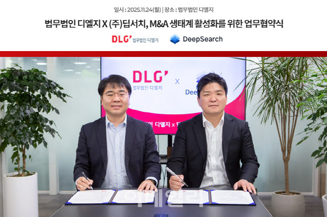 양사는 이번 협약을 통해 딥서치 플랫폼 기반으로 유입된 인수 희망 수요와 기업 정보를 디엘지에 연계하고, 디엘지는 해당 거래에 대해 정밀한 법률 검토와 구조 조정을 수행함으로써 딜 소싱부터 계약 체결까지 유기적인 협력 체계를 구축하게 된다.