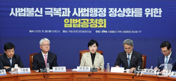 전현희 더불어민주당 사법불신 극복·사법행정 정상화 TF 단장이 25일 사법불신 극복과 사법행정 정상화를 위한 입법공청회에서 발언하고 있다. 2025.11.25/뉴스1 © News1 신웅수 기자
