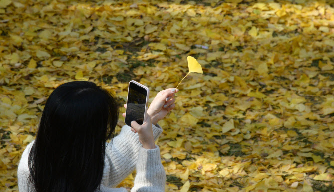 완연한 가을 날씨가 이어지고 있는 20일 전북 전주시 전주향교를 찾은 한 시민이 낙엽사진을 찍고 있다. (사진=뉴시스)