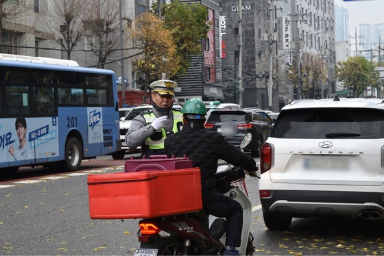 이어 오후 2시 55분쯤에는 초등학생 자녀를 데리러 가던 학부모가 전동 자전거를 운전하며 안전모를 쓰지 않아 단속됐다. 그는 "안전모는 집에 있다"고 작은 목소리로 말했다.