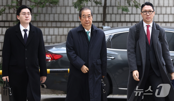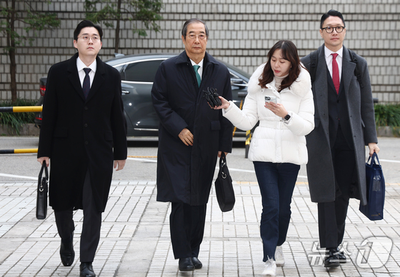 내란 우두머리 방조와 내란 중요임무 종사 혐의 등으로 재판에 넘겨진 한덕수 전 국무총리는 이날 변호인들과 함께 결심공판에 출석했다. .