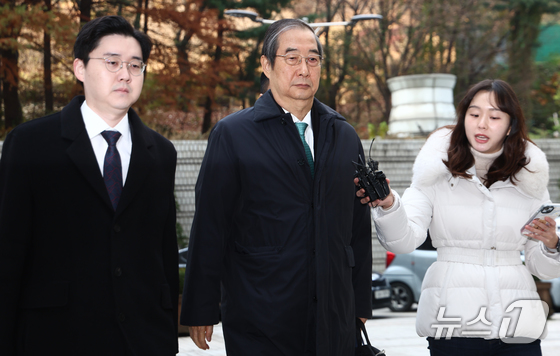 윤석열 전 대통령의 12·3 비상계엄을 적극적으로 말리지 않은 혐의로 재판에 넘겨진 한덕수 전 국무총리가 26일 오전 서울 서초구 서울중앙지방법원에서 열린 내란 우두머리 방조, 내란 중요임무 종사 등 혐의 사건 1심 결심 공판에 출석하고 있다. 2025.11.26/뉴스1 © News1 김민지 기자