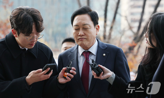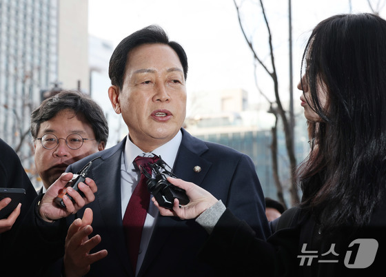 김선교 국민의힘 의원이 26일 서울 종로구 광화문 KT 빌딩에 마련된 김건희 특검(특별검사 민중기) 사무실에 피의자 신분으로 출석하며 취재진 질문에 답하고 있다. 2025.11.26/뉴스1 © News1 박지혜 기자