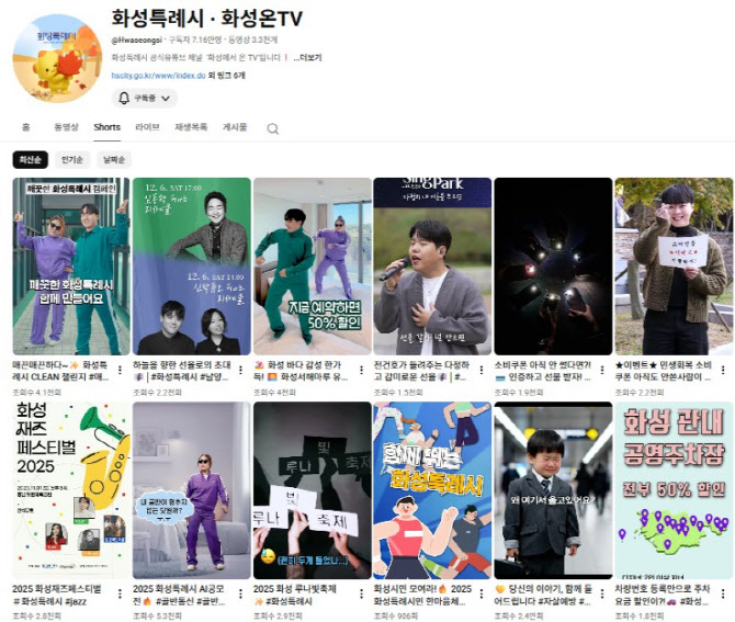 이런 성장세는 대표 홍보채널인 유튜브에서 더욱 뚜렷하게 나타난다. 지난 10월 기준, 화성특례시 공식 유튜브 ‘화성특례시·화성온TV’는 구독자 7만명을 넘어 전국 226개 기초지자체 중 2위에 올랐다. 총 조회 수 또한 1231만회를 돌파해 구독 규모와 콘텐츠 소비력 모두에서 양적·질적 성장을 동시에 달성했다.