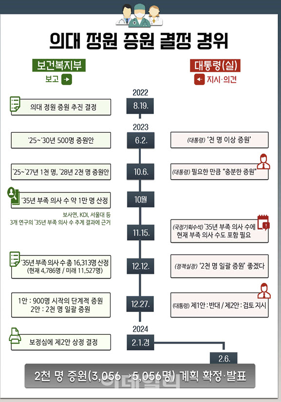 이미 대통령실이 답을 정한 상황에서 복지부가 내놓을 수 있는 더 이상의 카드는 없었다. 복지부는 대통령·대통령비서실 간 ‘2000명 일괄 증원안’에 대해 어느 정도의 공감대가 형성되어 있다고 판단해 일괄 2000명 증원안을 보건의료정책심의위원회에 올렸다. 의료계가 발칵 뒤집힌 의료 대란의 시작이었다.
