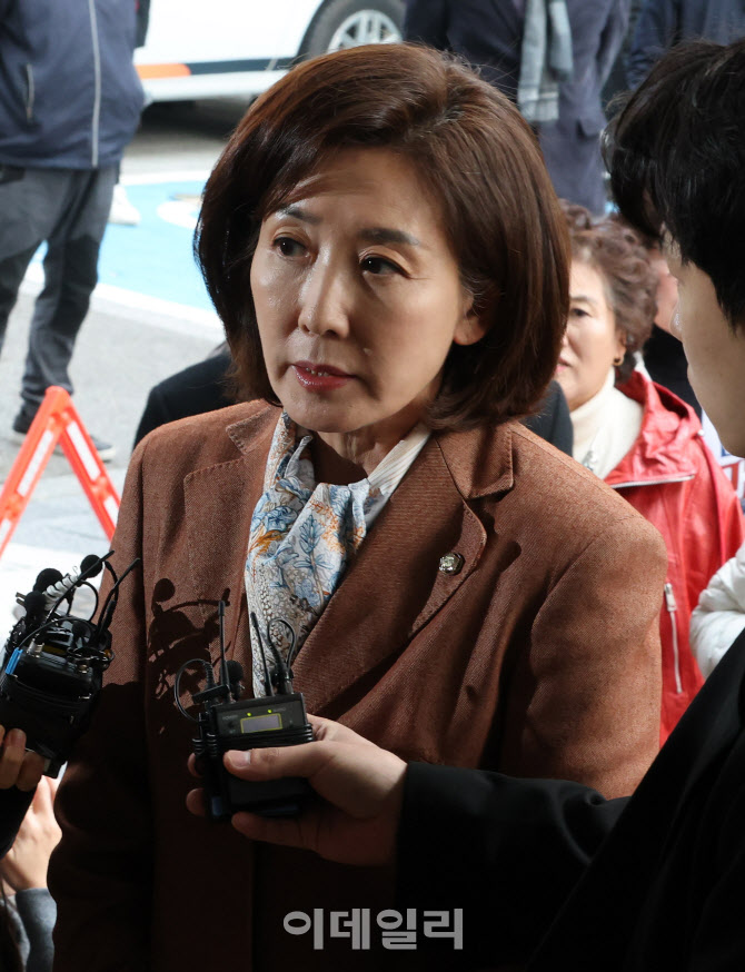 나경원 국민의힘 의원이 20일 서울 양천구 서울남부지방법원에서 열린 ‘국회 패스트트랙 충돌’ 1심 선고 공판 들어서며 취재진의 질의에 답하고 있다. (사진=방인권 기자)