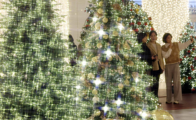 26일 부산 해운대구 신세계센텀시티 지하2층 중앙광장을 찾은 시민들이 화려하게 불을 밝힌 트리를 배경으로 기념사진을 찍고 있다. (사진=뉴시스)