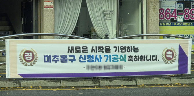 미추홀구 거리에 게첩된 관변단체의 신청사 기공식 축하 현수막. (사진 = 더불어민주당 인천시당 제공)