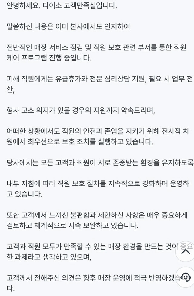 당초 다이소 측 대응이라고 알려진 내용이다. 그러나 다이소는 이에 대해 일대일 답변에 불과하며 공식 입장이 아니라고 선을 그었다. 다만 직원 케어에 최선을 다하겠다고 말했다. (사진=사회관계망서비스)