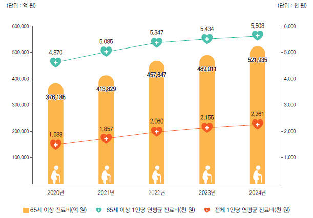 노인 1인당 의료비도 증가 추세다. 지난해 65세 이상 1인당 연평균 진료비는 약 550만 8000원으로 전체 1인당 연평균 진료비(226만 1000원 년 대비 약 2.4배에 달한다.