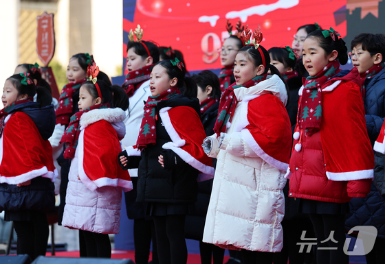 2025 구세군 연말 모금 캠페인이 시작된 28일 오전 서울 광화문광장에서 열린 2025 구세군 자선냄비 시종식에서 서울주니어합창단 어린이들이 축하 공연을 하고 있다. 2025.11.28/뉴스1 © News1 오대일 기자