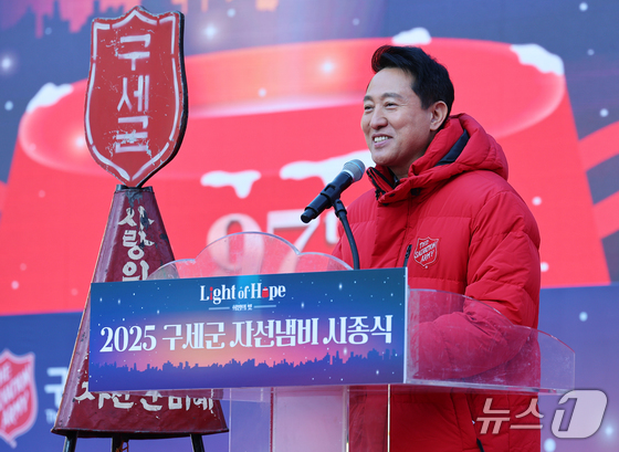 오세훈 서울시장이 28일 오전 서울 광화문광장에서 열린 2025 구세군 자선냄비 시종식에서 축사를 하고 있다. 2025.11.28/뉴스1 © News1 오대일 기자