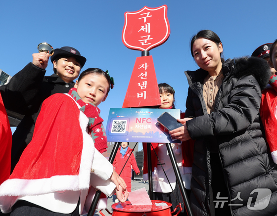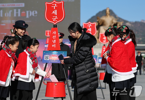 2025 구세군 연말 모금 캠페인이 시작된 28일 오전 서울 광화문광장에서 열린 2025 구세군 자선냄비 시종식에서 서울주니어합창단 어린이들과 학부모가 NFC 모금 시연을 하고 있다. 올해로 97번째를 맞는 구세군 연말 자선냄비 모금 캠페인은 'Light of Hope'(희망의 빛)을 주제로 전국 300여 곳에서 진행된다. 올해 자선냄비에는 NFC 기반 ‘원태그 스마트기부’가 새롭게 도입돼 현금 없이도 손쉽게 참여할 수 있다. (공동취재) 2025.11.28/뉴스1 © News1 오대일 기자
