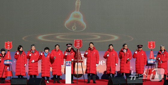 28일 오전 서울 광화문광장에서 열린 2025 구세군 자선냄비 시종식에서 오세훈 서울시장과 김병윤 구세군 사령관을 비롯한 참석자들이 타종 세리머니를 하고 있다. 2025.11.28/뉴스1 © News1 오대일 기자