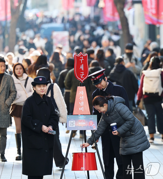2025 구세군 연말 모금 캠페인이 시작된 28일 오후 서울 중구 명동거리에서 시민들이 구세군 자선냄비에 기부하고 있다. 2025.11.28/뉴스1 © News1 오대일 기자