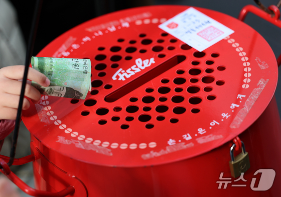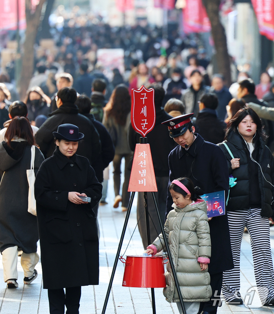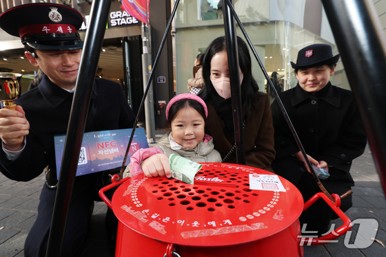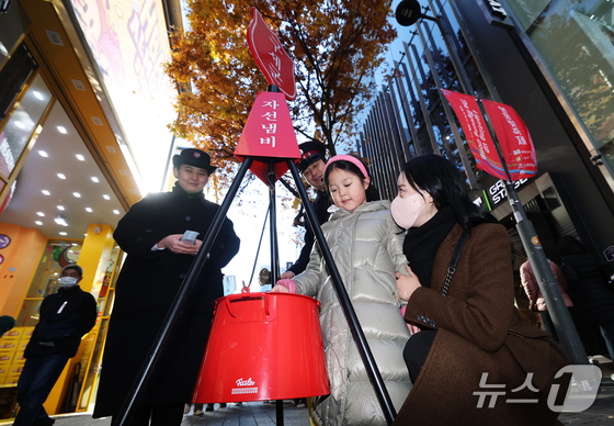 2025 구세군 연말 모금 캠페인이 시작된 28일 오후 서울 중구 명동거리에서 한 어린이가 엄마와 함께 자선냄비에 기부하고 있다. 2025.11.28/뉴스1 © News1 오대일 기자