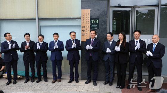 순직해병특별검사팀 이명현 특별검사와 특검 지휘부가 지난 7월 2일 오전 서울 서초구 서초중앙로 특검사무실에서 현판식을 열고 본격 수사에 착수했다.갖고 있다. 특검팀은 이날 첫 조사로 구명 로비 의혹을 받는 임성근 전 해병대 1사단장을 소환했다. 2025.7.2/뉴스1 © News1 박정호 기자