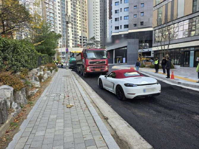 작성자가 공개한 사진에는 아스팔트 포장 공사가 이뤄지는 가운데 차량 한 대가 작업 위치에 주차돼 있어 작업이 중단된 모습이 담겼다.