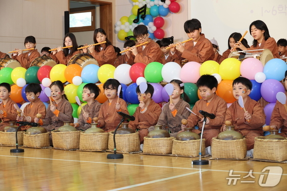 성읍초 전교생이 '벨롱벨롱 꿈자랑 발표회'에서 제주 전통음악을 연주하고 있다.(서울시교육청 제공)
