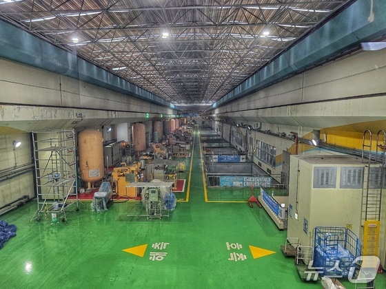 한국수자원공사 시화조력발전 내부 모습. 바다와 호수 중간에 설치돼 있는 만큼 바닥에 '해측'과 '호측'이 크게 작성돼 있다. 이 사이 지하에 터빈 발전기가 설치돼 있다. © 뉴스1 황덕현 기자