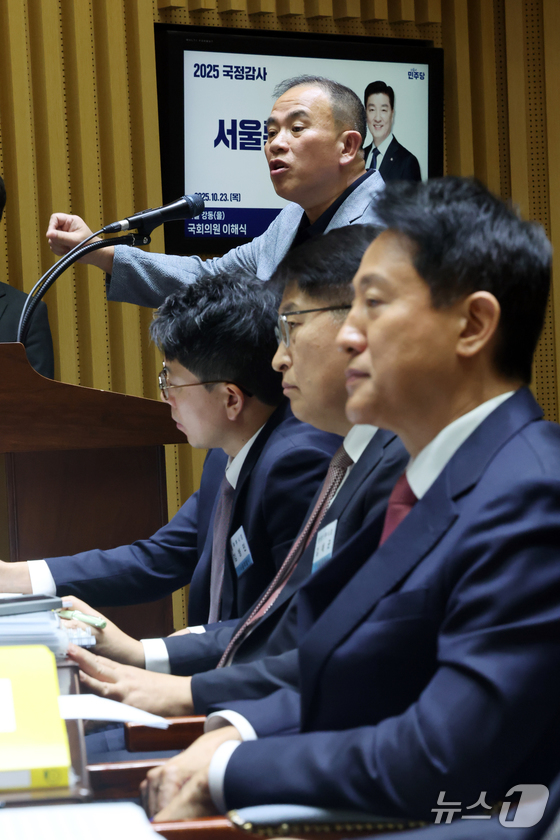 '정치 브로커' 명태균씨가 23일 오후 서울 중구 서울시청에서 열린 국회 행정안전위원회 서울시청 국정감사에서 의원질의를 마치고 오세훈 서울시장 뒤로 이동하고 있다. 2025.10.23/뉴스1 © News1 황기선 기자