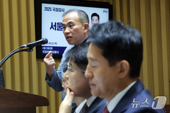 '정치 브로커' 명태균씨가 23일 오후 서울 중구 서울시청에서 열린 국회 행정안전위원회 서울시청 국정감사에서 의원질의에 답하고 있다. 2025.10.23/뉴스1 © News1 황기선 기자