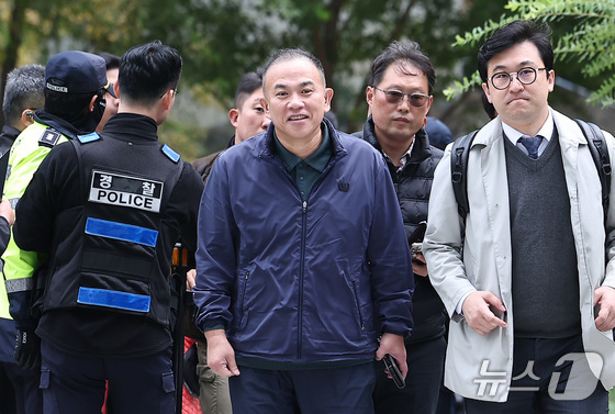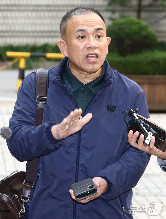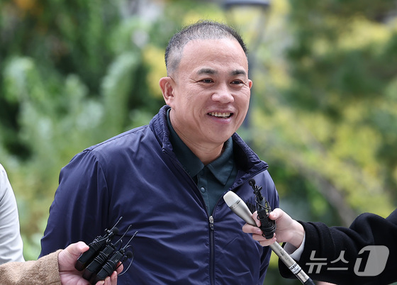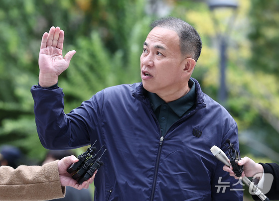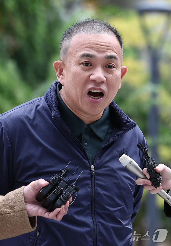 정치 브로커 명태균 씨가 7일 오전 서울 서초구 서울중앙지법에서 열린 김건희 여사의 자본시장법 위반 등 혐의 속행 공판에 증인으로 출석하며 입장을 밝히고 있다. 2025.11.7/뉴스1 © News1 김민지 기자