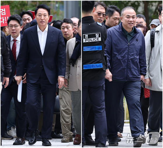 오세훈 서울시장(왼쪽)과 '정치 브로커' 명태균 씨가 8일 서울 종로구 KT광화문빌딩에 마련된 김건희 특검(특별검사 민중기) 사무실에 조사를 받기 위해 출석하고 있다. 2025.11.8/뉴스1 © News1 김성진 기자