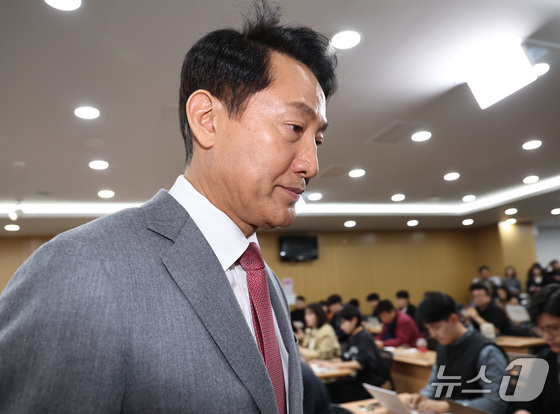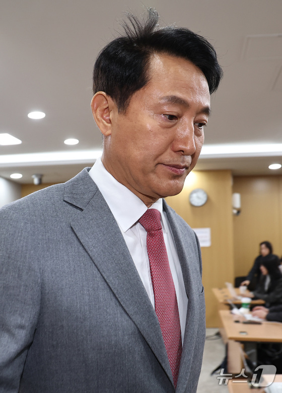 오세훈 서울시장이 1일 오후 서울시청 브리핑실에서 김건희 특검이 오 시장을 '명태균 여론조사비' 대납 혐의로 기소한 것과 관련 입장을 발표 후 나서고 있다. 2025.12.1/뉴스1 © News1 구윤성 기자