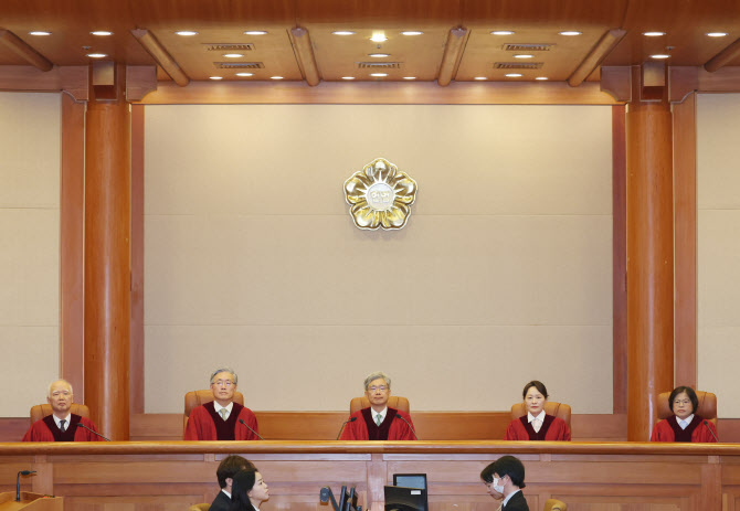 김상환 헌법재판소장 등이 27일 서울 종로구 헌재 대심판정에서 11월 심판사건 선고를 앞두고 자리에 앉아 있다. (사진=연합뉴스)