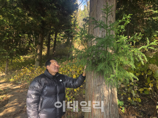 정은조 윤제원 회장이 선친이 식재한 나무를 봐라보고 있다. (사진=박진환 기자)