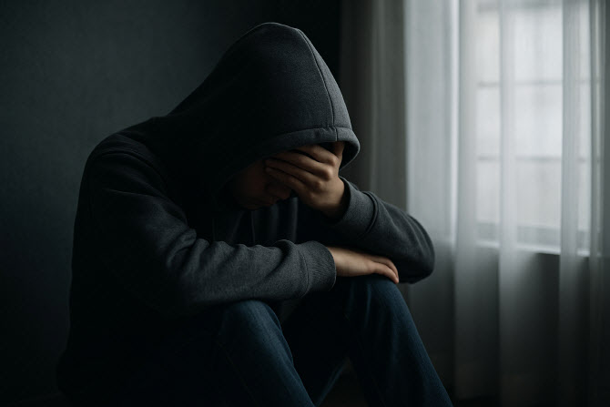 고민에 빠진 청년이 어두운 방에서 고개를 숙인 채 앉아 있는 AI 이미지(사진=챗GPT)