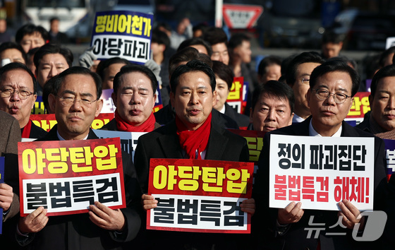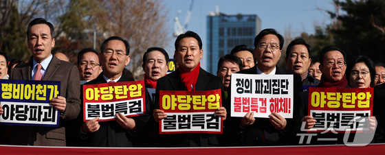장동혁 대표와 송언석 원내대표를 비롯한 국민의힘 의원들이 2일 오후 서초구 서울중앙지방법원 앞에서 열린 추경호 의원 구속심사 규탄대회에서 구호를 외치고 있다. 2025.12.2/뉴스1 © News1 구윤성 기자