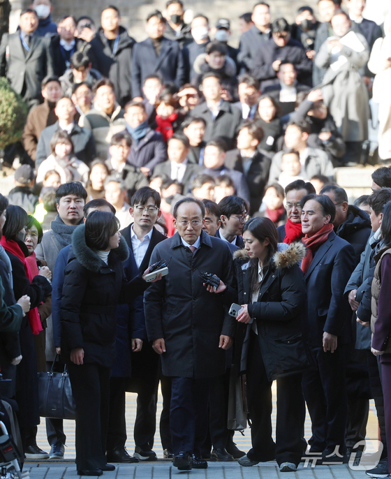 계엄 해제 표결 방해 혐의를 받는 추경호 국민의힘 전 원내대표가 2일 서울 서초구 서울중앙지방법원에서 열린 구속 전 피의자심문(영장실질심사)에 국민의힘 의원들의 응원을 받으며 출석하고 있다. (공동취재) 2025.12.2/뉴스1 © News1 오대일 기자