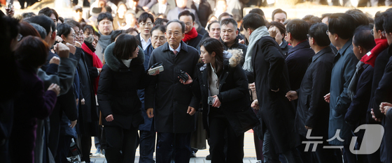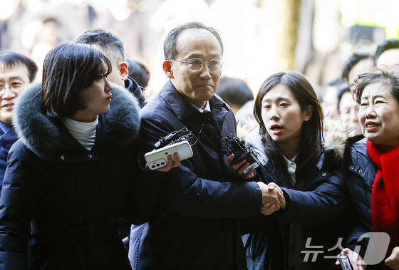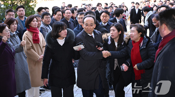 추경호 국민의힘 의원이 2일 서울 서초구 서울중앙지방법원에서 열린 구속 전 피의자 심문(영장실질심사)에 출석하며 국민의힘 의원들의 응원을 받고 있다. (공동취재) 2025.12.2/뉴스1 © News1 오대일 기자