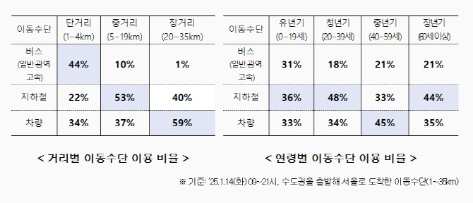 이동 거리뿐 아니라 연령대에 따라 교통수단 선호도 차이도 뚜렷하게 나타남을 확인했다. 청년층(20~39세)은 지하철 이용이 48%로 가장 높았다. 중년층(40~59세)은 차량 이용 비중이 45%로 가장 컸고 장년층(60세 이상)은 다시 지하철 이용 비중이 44%로 높아지는 경향을 보였다.