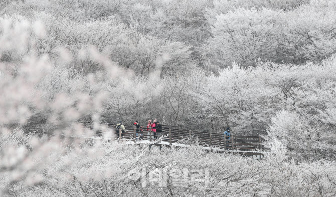기습 추위가 절정에 달한 4일 오전 제주 한라산 1100고지를 찾은 관광객들이 활짝 피어난 상고대를 감상하며 겨울 정취를 만끽하고 있다.(사진=뉴시스)