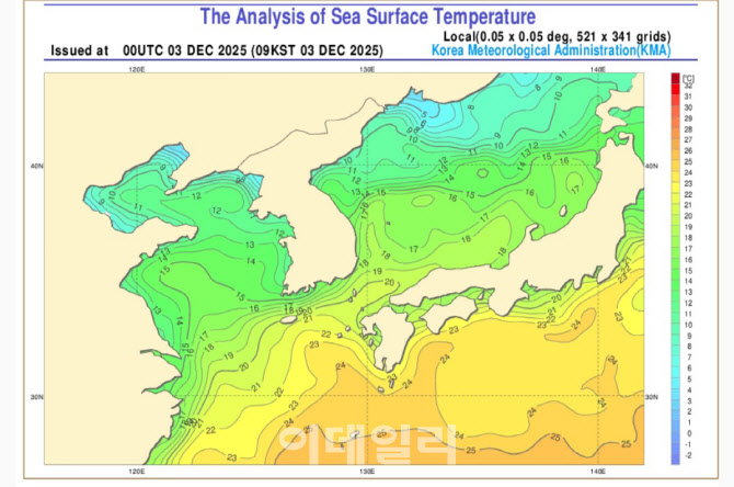 지난 3일 기준 우리나라 주변의 해수면 온도가 관측된 사진.(사진= 기상청)