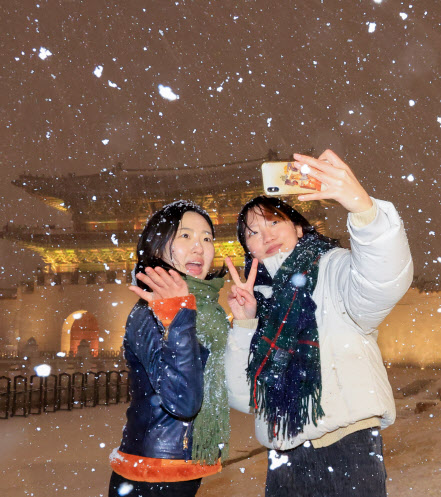 서울 지역에 올해 첫눈이 내린 4일 서울 광화문광장에서 시민들이 휴대전화로 셀피 사진을 촬영하며 첫눈을 즐기고 있다. (사진=연합뉴스)