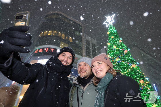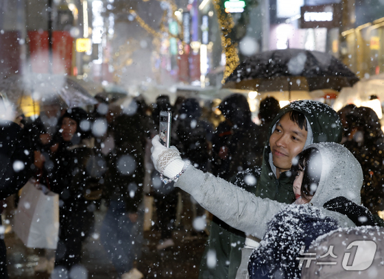 첫눈이 내린 4일 오후 서울 중구 명동을 찾은 관광객들이 내리는 눈을 맞으며 즐거운 시간을 보내고 있다. 기상청은 "퇴근 시간대 강한 눈이 내릴 가능성이 크다"며 동네 예보와 실시간 날씨를 확인할 것을 당부했다. 2025.12.4/뉴스1 © News1 박정호 기자