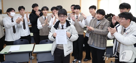 2026학년도 대학수학능력시험 성적표 배부일인 5일 전북 전주시 한일고등학교에서 수능 만점자 이하진 학생이 친구들의 축하를 받고 있다. 2025.12.5/뉴스1 © News1 유경석 기자