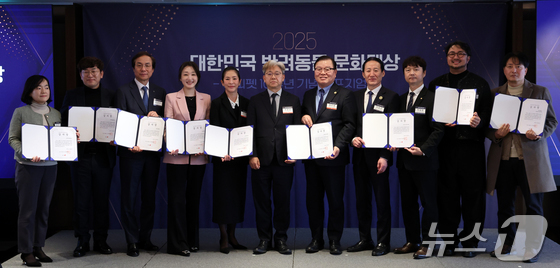 3일 서울 중구 롯데호텔에서 열린 2025 대한민국 반려동물 문화대상에서 해피펫 10주년 기념 감사장 수상자들이 기념촬영을 하고 있다. 2025.12.3/뉴스1 © News1 김명섭 기자