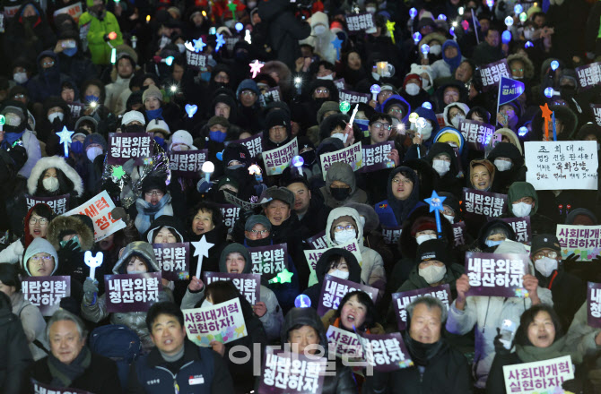 3일 서울 여의도 국회의사당 앞 대로에서 12.3 내란외환 청산과 종식, 사회대개혁 시민대행진이 열렸다. 행사에서 참가한 시민들이 응원봉과 피켓을 들고 구호를 외치고 있다. (사진= 노진환 기자)