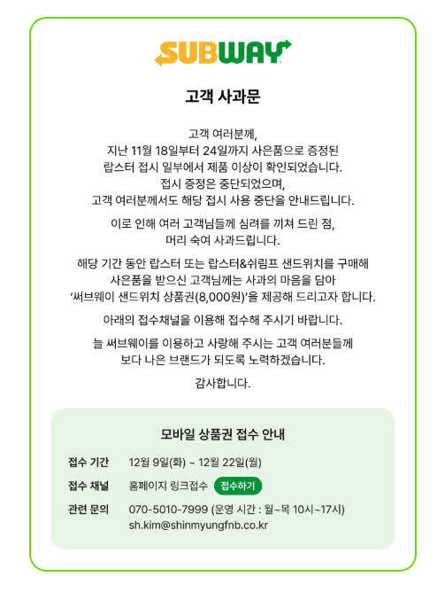 써브웨이는 이날 공식 홈페이지에 사과문을 게재하고 “이번 사안으로 우려를 끼쳐드린 점에 대해 깊이 사과드린다”며 “필요한 모든 조치를 신속하고 책임 있게 수행하겠다”고 밝혔다. 또한 행사 기간 동안 문제의 사은품을 받은 고객을 대상으로 8000원 상당의 모바일 상품권을 지급하겠다고 했다.